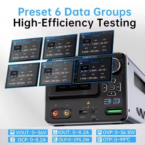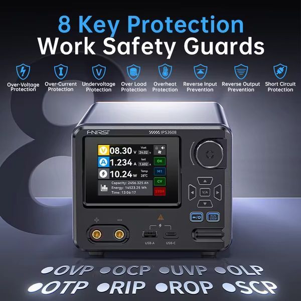 FNIRSI IPS3608 — сучасне рішення для живлення, заряджання та тестування різних електронних пристроїв. Завдяки цифровій системі контролю він ефективно перетворює змінний струм (AC) на стабільний постійний (DC), забезпечуючи точні вихідні параметри та гнучке налаштування напруги й струму. Прилад вирізняється швидким реагуванням на зміну навантаження, розширеними функціями та системою із 8 видів захисту, що гарантує безпечну роботу.