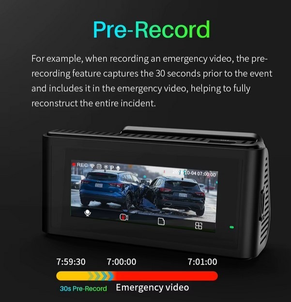 Наприклад, під час запису відео про надзвичайну ситуацію функція попереднього запису захоплює 30 секунд до події та включає їх до відео про надзвичайну ситуацію, допомагаючи повністю реконструювати весь інцидент.