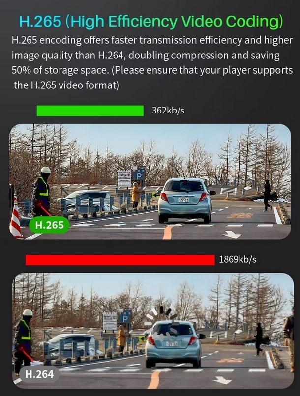 Кодування H.265 пропонує швидшу передачу та вищу якість зображення, ніж H.264, подвоюючи стиснення та заощаджуючи 50% місця для зберігання. (Переконайтеся, що ваш плеєр підтримує відеоформат H.265).