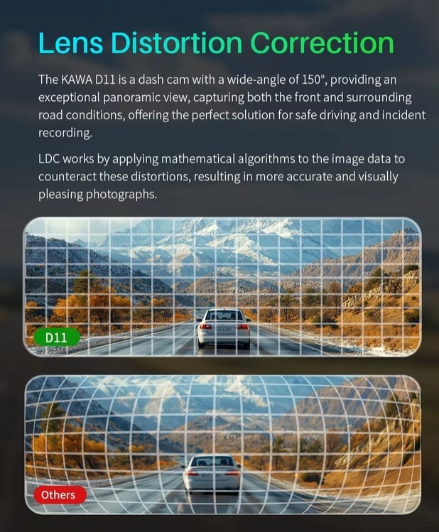 KAWA D11 із ширококутним об’єктивом 150° забезпечує винятковий панорамний огляд дороги для безпечного водіння та запису подій. LDC використовує математичні алгоритми для виправлення спотворень зображення, що призводить до отримання точніших та візуально приємніших фотографій.