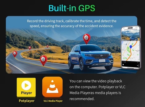 Передній та задній відеореєстратори KAWA записують траєкторію руху, калібрують час та визначають швидкість, забезпечуючи точність даних про аварії. Медіаплеєр, рекомендований KAWA: Potplayer/VLC Media Player.