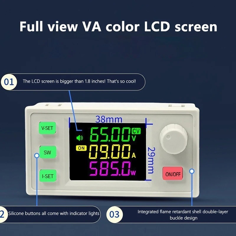 Налаштування включається кнопкою V SET – напруги при індикації CV, I SET – струму за CC. Розряди перемикаються натисканням на енкодер (крутилку), значення змінюються поворотом. Вихідна напруга вмикається кнопкою під енкодером (індикація ON увімкнено), довге натискання – скидання ємності мАг. Кнопка SW відображає вхідну/вихідну напругу. Третій рядок можна встановити на індикацію потужності, ємності мАг, енергії Втч, часу заряду натисканням на енкодер.