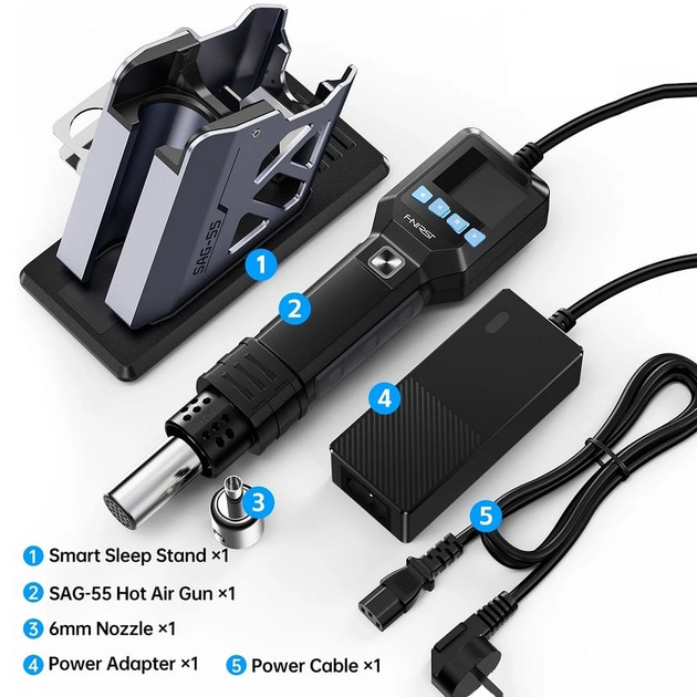 - Комплектація: Підставка Smart Sleep Stand x1, фен SAG-55 x1, 6-міліметрове сопло x1, Адаптер живлення x1, Кабель живлення x1, Інструкція користувача англійською × 1