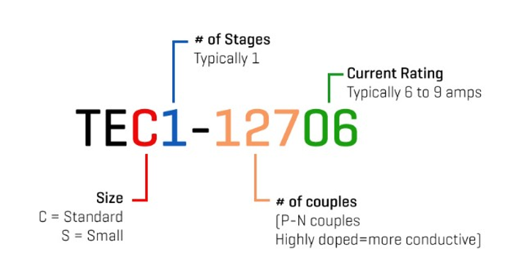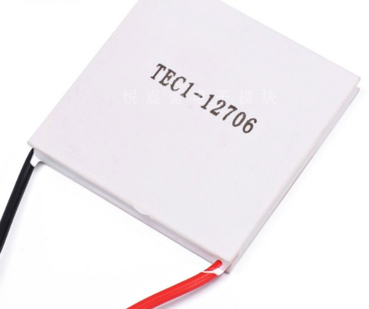 TEC1-12706 складається з послідовного з’єднання безлічі напівпровідникових елементів, що чергуються, “n” і “p” типів. При проходженні постійного струму через таке з’єднання одна сторона контактів p-n буде нагріватися, інша навпаки – охолоджуватися. Напівпровідникові елементи розташовані на двох керамічних пластинах, з’єднаних між собою таким чином, щоб контакти, що нагріваються, виходили на один бік пластини, а охолоджуються на іншу.