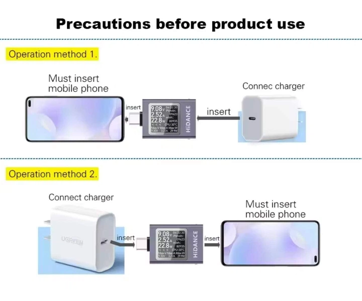ЗВЕРНІТЬ УВАГУ: для роботи потрібне навантаження, тобто тестер підключається між зарядним пристроєм та споживачем (смартфоном/ноутбуком/повербанком).