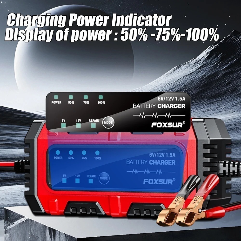 Компактний зарядний пристрій для акумуляторів мотоциклів або автомобілів 12 В 1.5 А. Пристрій повністю автоматичний з трьома етапами заряду. Підходить для заряду будь-яких свинцево-кислотних та гелевих акумуляторів. Наявність інтелектуального дисплея дозволяє контролювати напругу і струм зарядки, а також показує заряд батареї у відсотках.